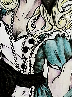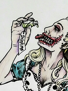 Alice with a zombie twist. Colored pencil with black ink outlining.